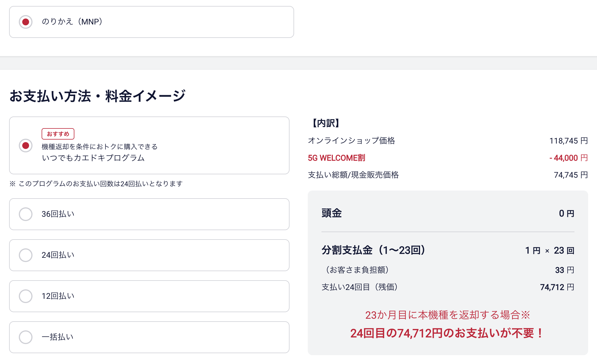 もし今のタイミングで特価端末を狙うなら「iPhone 16」MNP月額1円がお勧め。本体代金23円+諸経費10円しか発生せず、オンラインなら事務手数料0円。