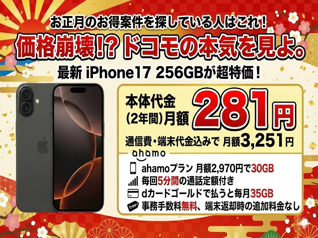 もうひとつ大人気なのが「iPhone 17」256GB 月額281円。在庫切れを繰り返しながら現在全カラーが再入荷。年明けから大人気案件となっている。