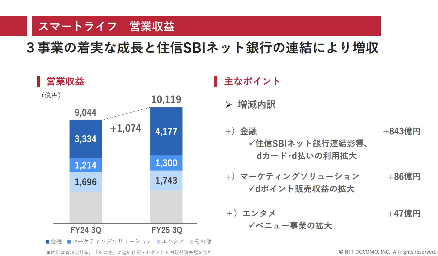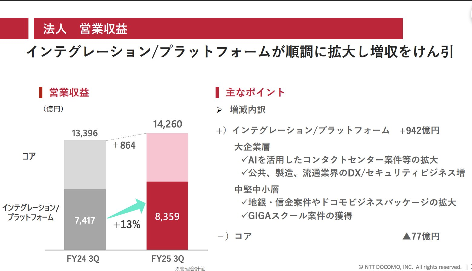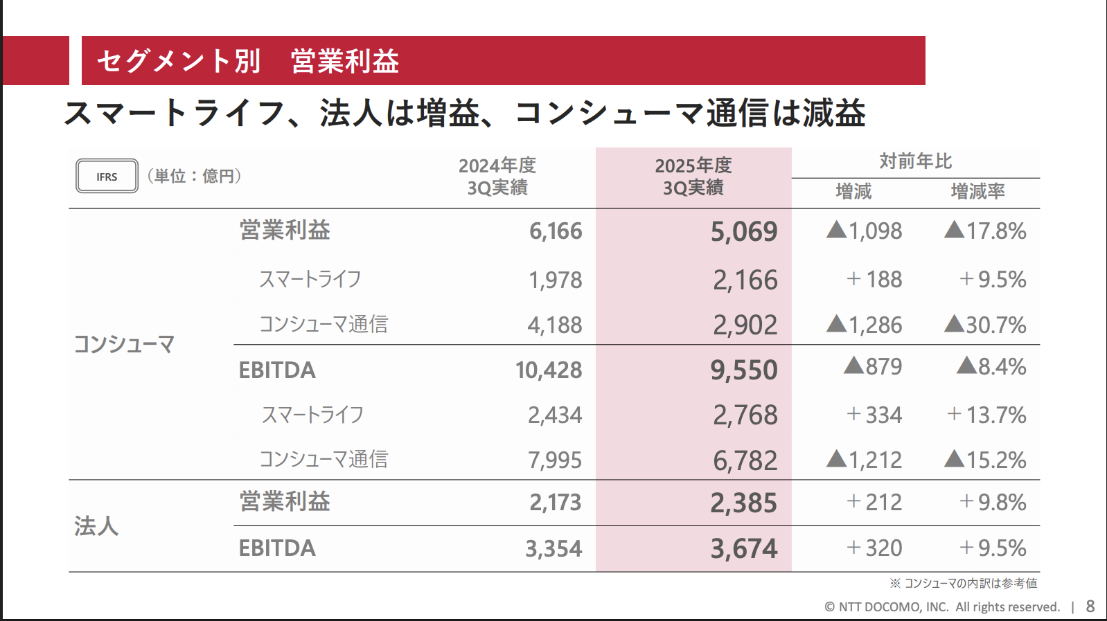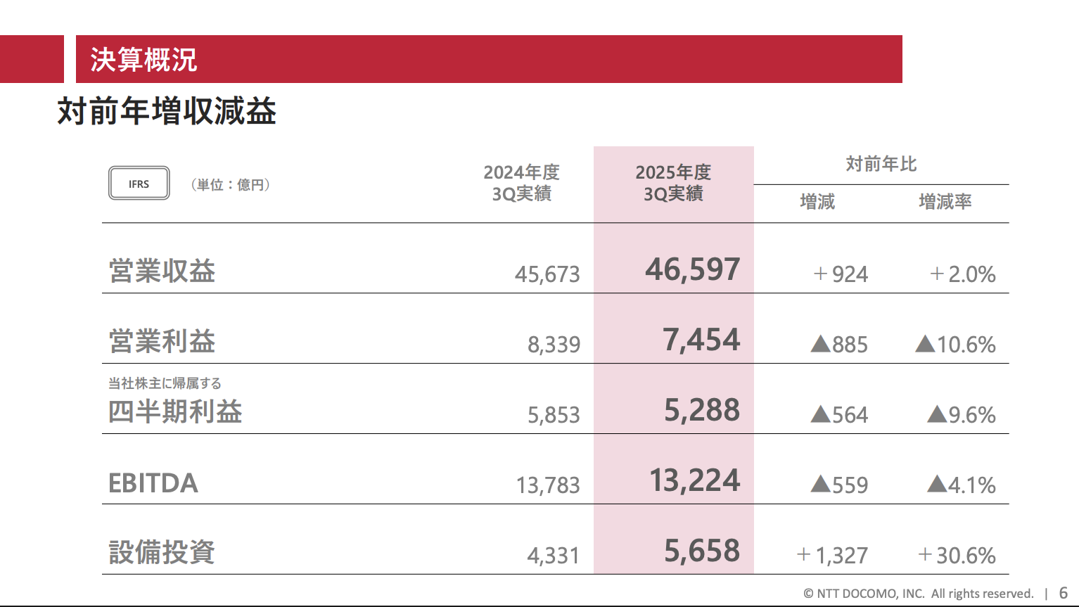 2月5日、NTTドコモは2026年3月期決算を発表した。営業収益は前年比+2%(924億増)を記録したものの、営業利益は前年比-10.6%(886億減)。携帯電話・スマートフォンのコンシューマ通信事業が大きく伸び悩んだ。