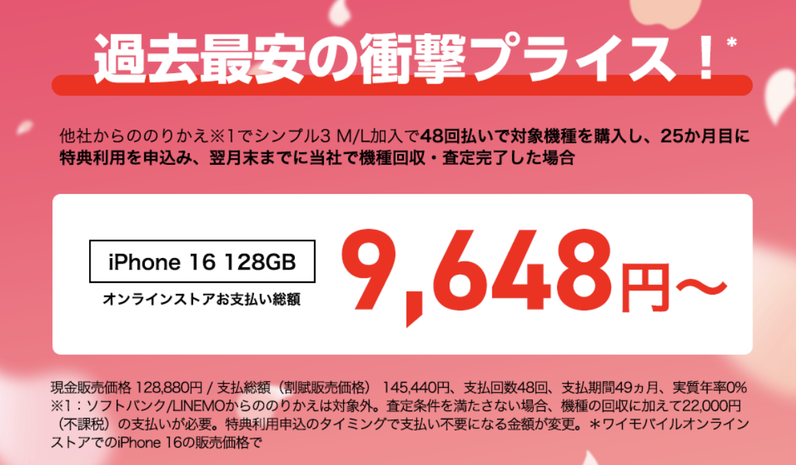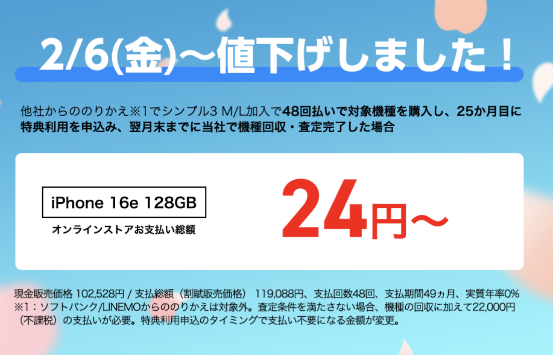 さらに「iPhone 16」128GBも月額402円に値下げ。同機種は1月に月額810円に値下げされたばかり。そこからほぼ半額の異例事態で、2年間の負担金額は9,648円。