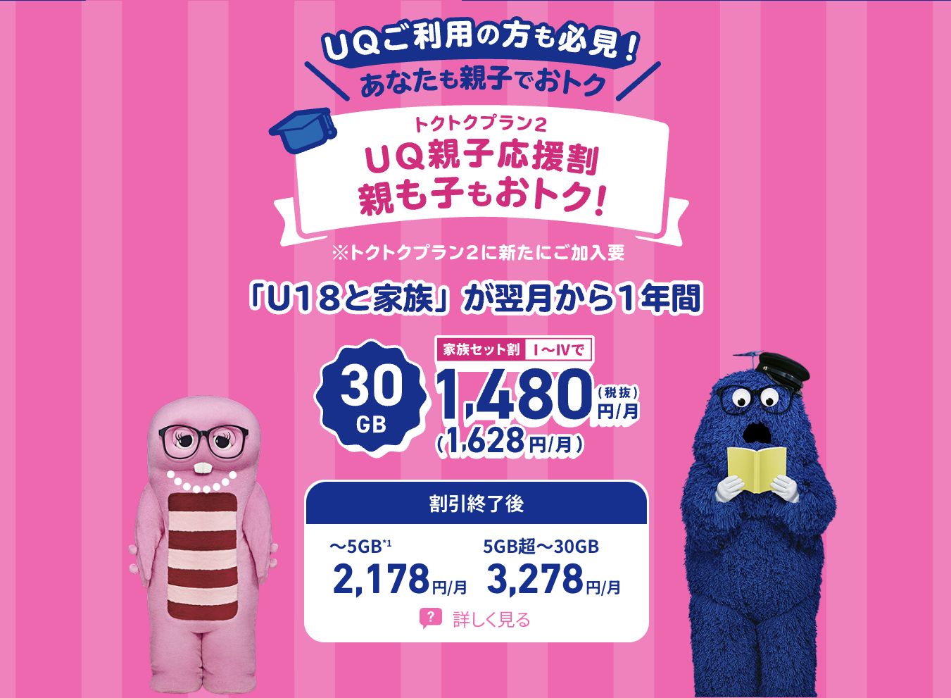 UQモバイルでは親子割が開始されており、18歳以下のお子さまと一緒に使うと550円の家族割+1年間1,650円が割引される。