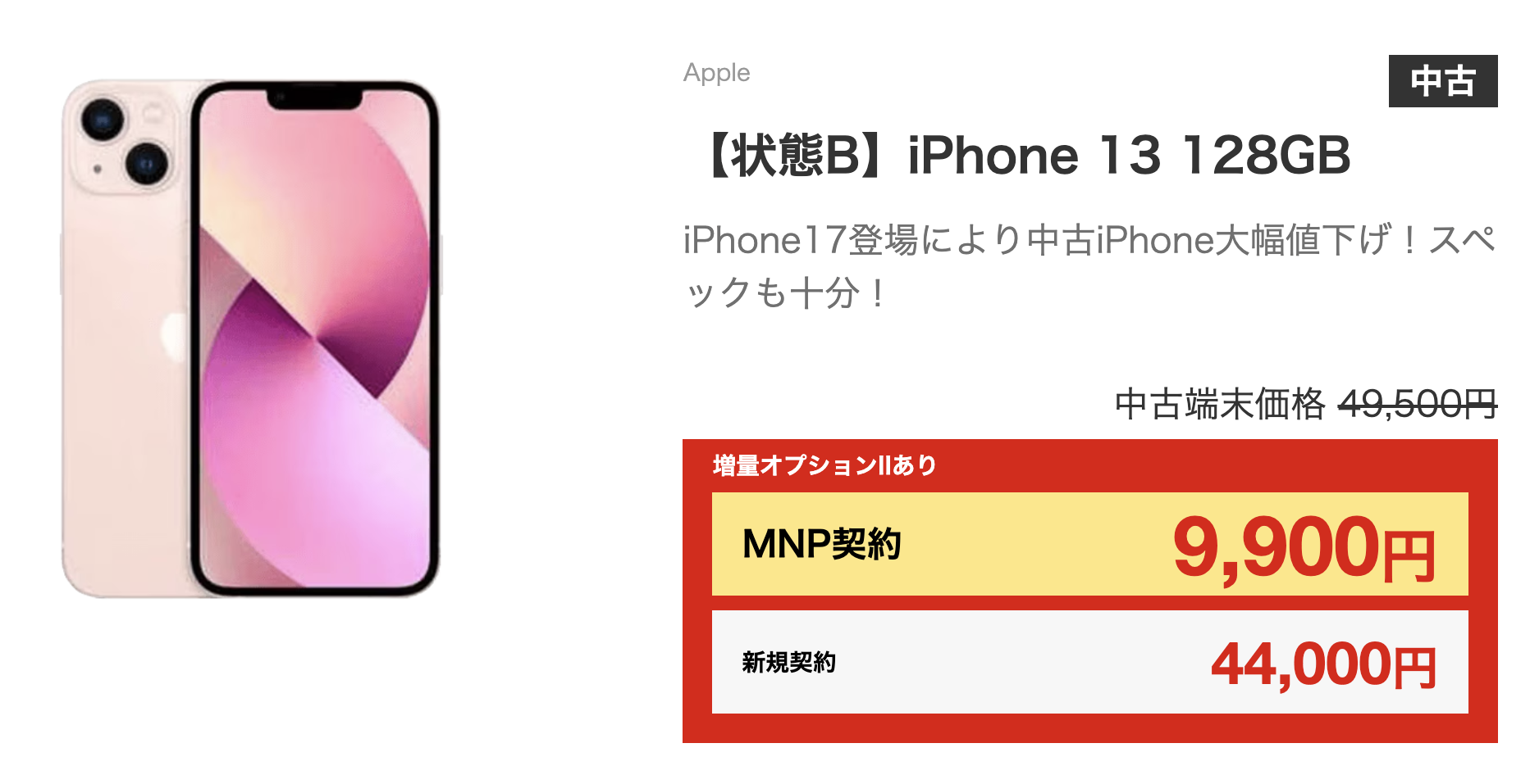もうひとつの狙い目は「iPhone 13」128GB 一括9,900円だろう。同機種は楽天モバイルの回線セット(一括18,800円)が大人気で、たびたび在庫切れを繰り返している。