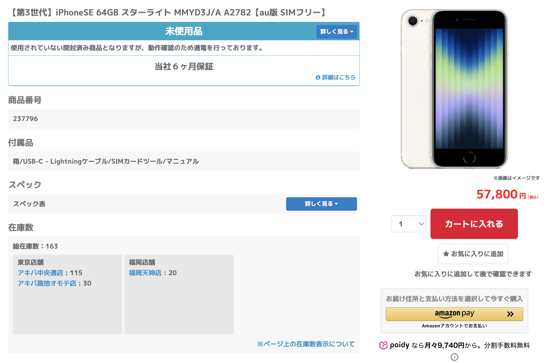中古PC・白ロムでお馴染みの「イオシス」に第3世代「iPhone SE」が57,800円で大量入荷している。いずれもau出荷モデル(SIMフリー)の未使用品で、2月7日時点の在庫数は150台以上。
