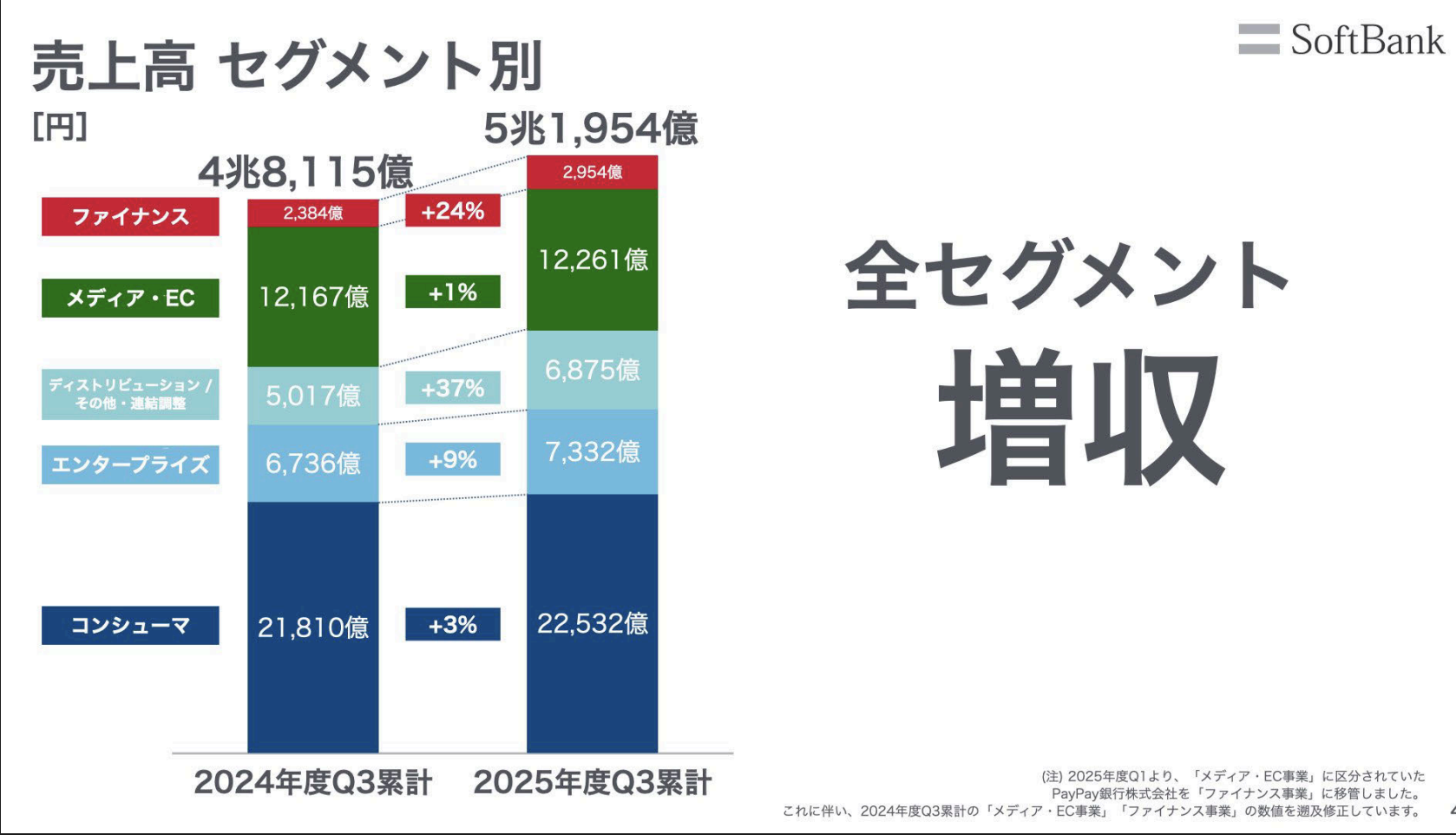 2月9日、ソフトバンク株式会社は2026年3月期決算を発表した。売上高は過去最高の5兆円1,954億円、全セグメント増収を記録。