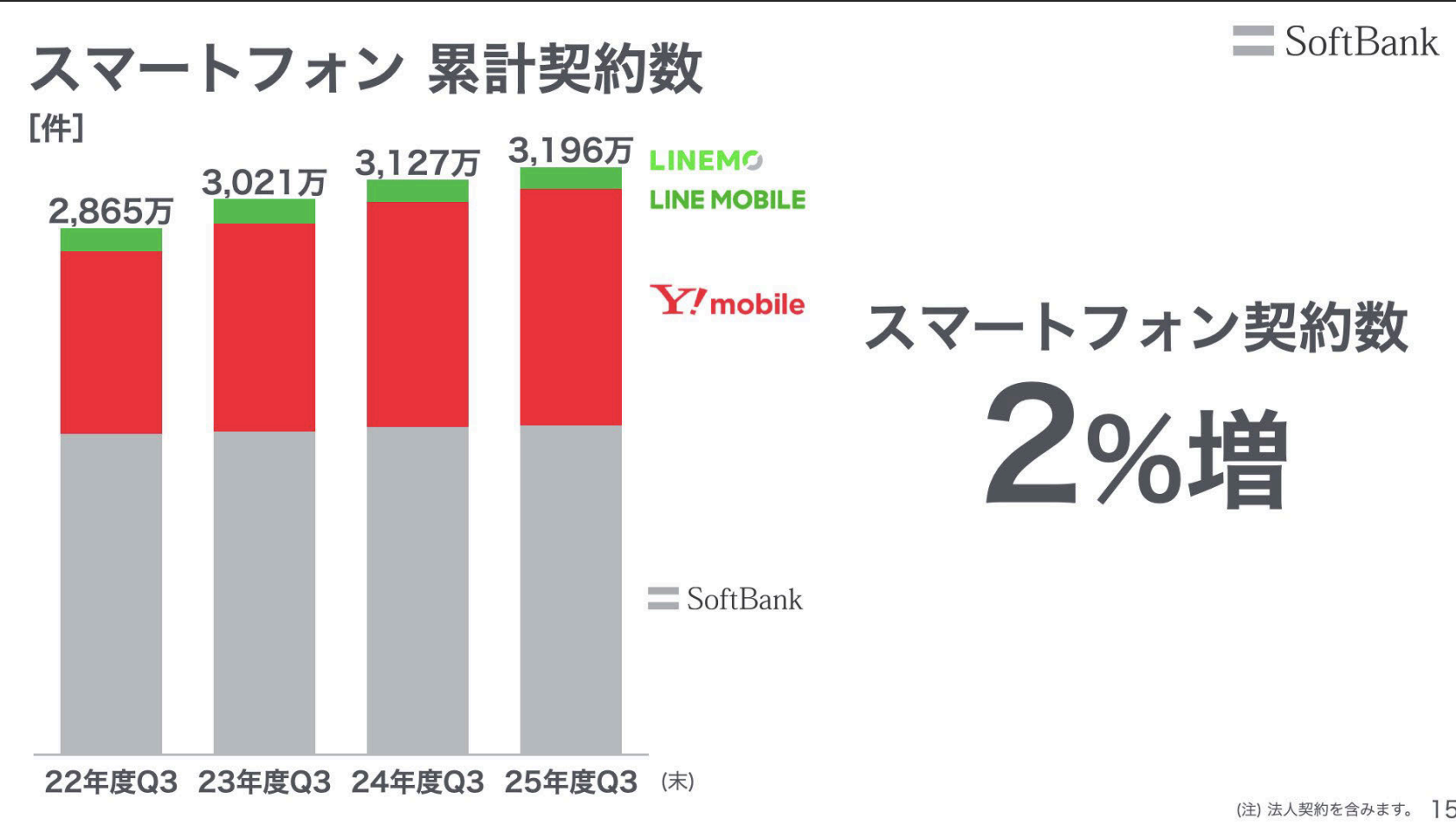 全体としては通期売上予想を上方修正する好決算だった。モバイル事業も契約者数+2%と堅調に推移。ソフトバンク、ワイモバイル、LINEMO(旧LINEモバイル)を含めた累計契約者数は3,196万件に達した。