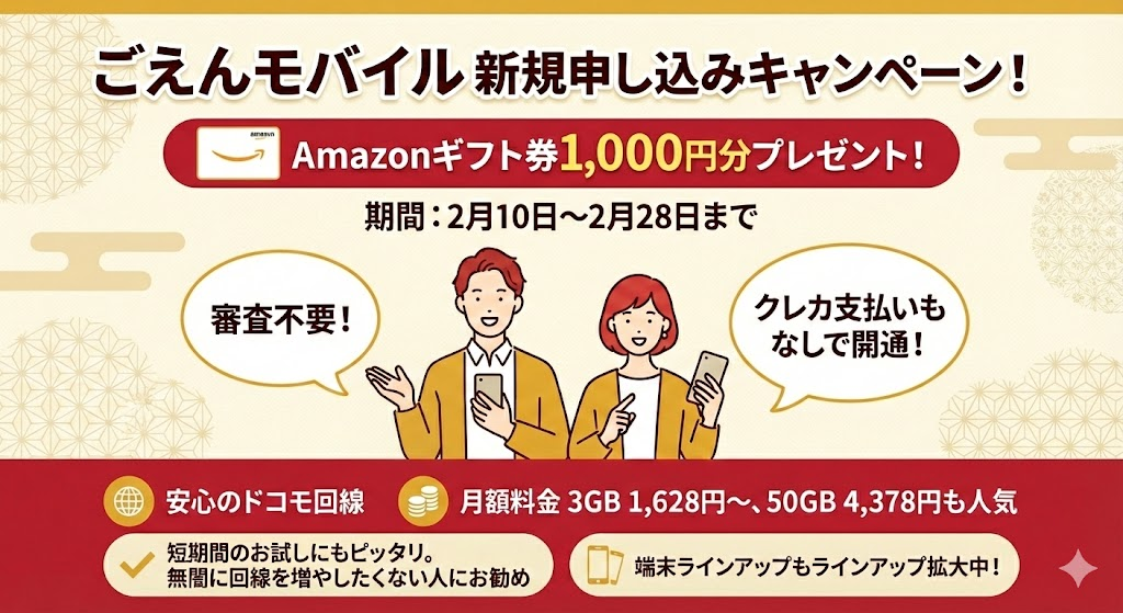 2月10日〜2月28日までの期間中、新規申し込みと開通を条件にAmazonギフト券1,000円をプレゼント。事務手数料3,850円の負担が大きく負担されるチャンスとなっている。
