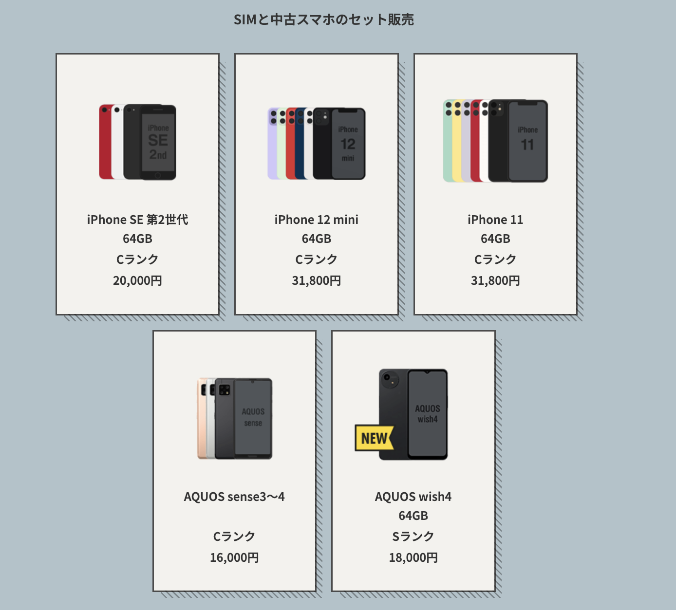 「iPhone SE」第2世代、「iPhone 12 mini」、「iPhone11」、「AQUOS Sense3〜4」のほか、直近では新しく「AQUOS WISH 4」がラインアップに追加。