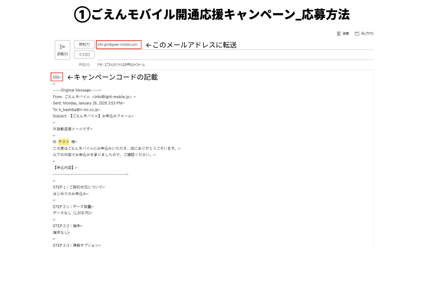 応募の方法:回線申し込み時に自動送信されるメールにキャンペーンコード「555」を記載して「info-gm@goen-mobile.com」宛に転送すればOK。