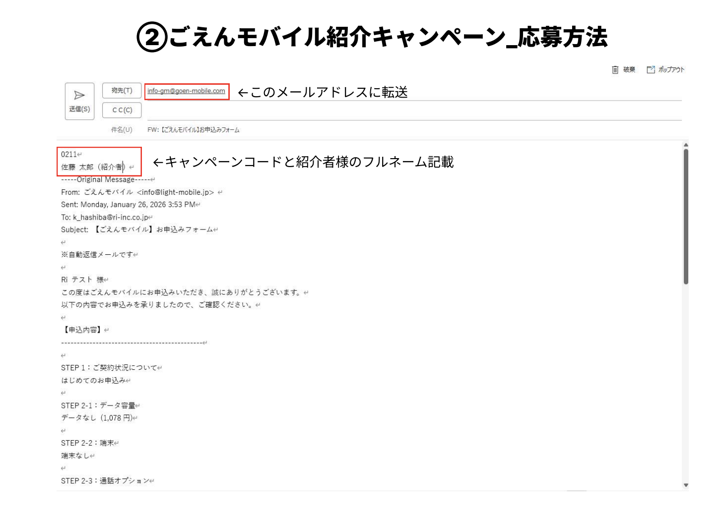 さらに家族やお友だちの紹介でも1,000円分のギフト券がもらえる。紹介された方は申し込み完了時の自動送信メールにキャンペーンコード「0211」と紹介者の氏名を併記して「info-gm@goen-mobile.com」に転送すればOK。