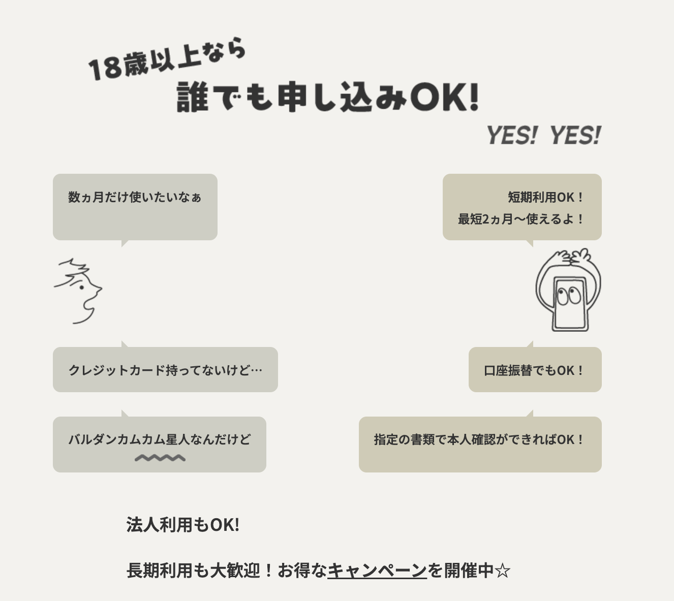 「MVNOに申し込みたいけどクレジットカードしか対応していない」「子どもにスマホをお試しで持たせてみたい」等のお悩みにもピッタリで18歳以上なら身分証明書の提出だけで申し込みできる。