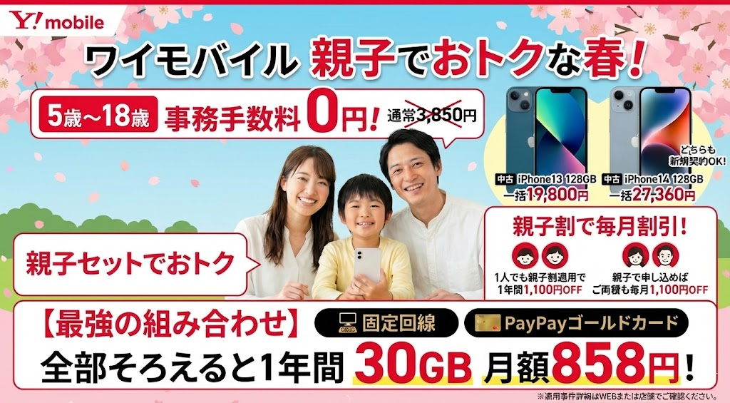 ワイモバイルが新しいキャンペーンを開始した。2月10日以降、5歳〜18歳の新規申し込み(Web経由)が事務手数料0円。