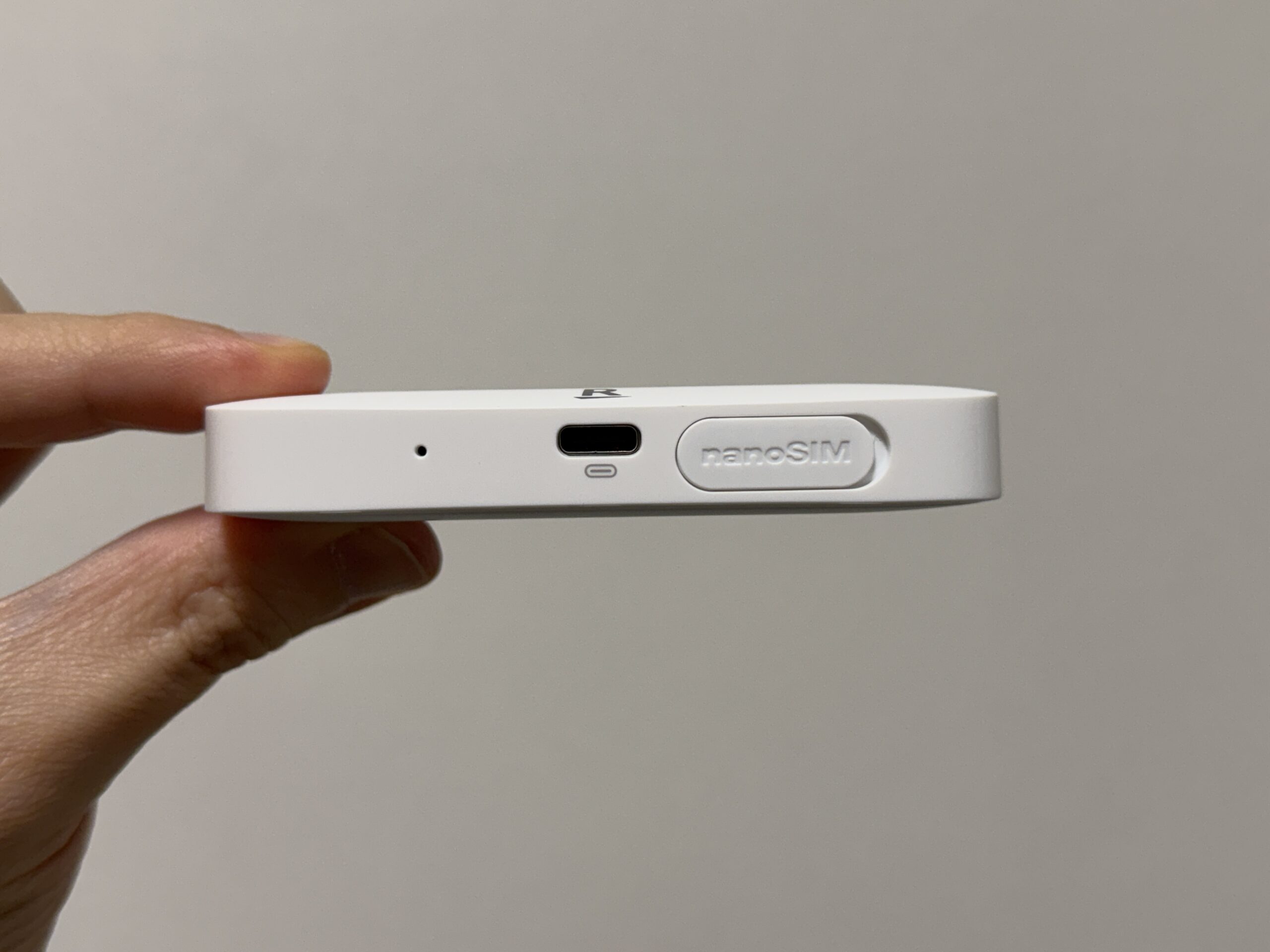 箱の中身はルーター本体と簡単な説明書のみ。手のひらにスッポリ収まるサイズ感で、側面にはUSB-Cケーブル端子、nano SIMスロットを搭載。とてもシンプルなデザインだ。