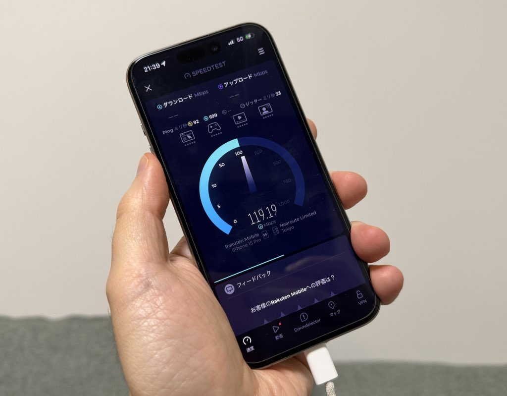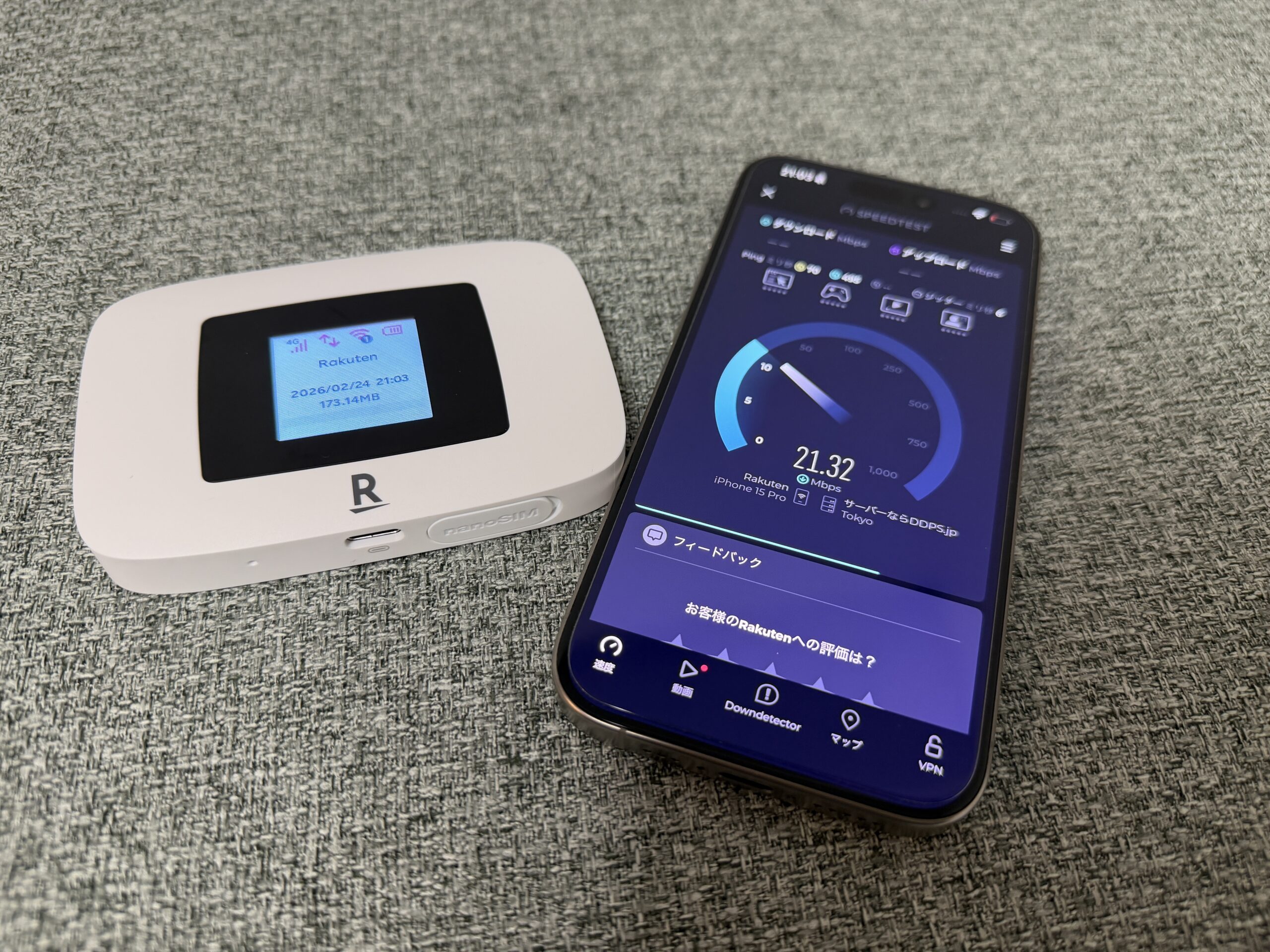 まずは「iPhone 15 Pro」にWi-Fi接続。何度かスピードテストした結果、6〜21Mbpsを観測。4G縛りのせいか、通常の楽天モバイル回線よりも明らかに遅い。