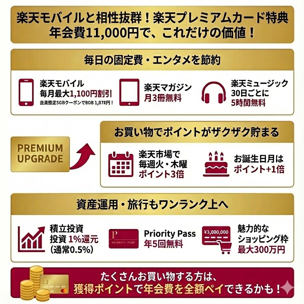 もちろんプレミアムカードの通常特典として、楽天モバイル毎月最大1,100円割引、お誕生日月ポイント+1倍、Priority Pass 年5回無料、積立投資1%還元、楽天トラベル決済で最大3倍、楽天マガジン月3冊無料といったメリットもある。