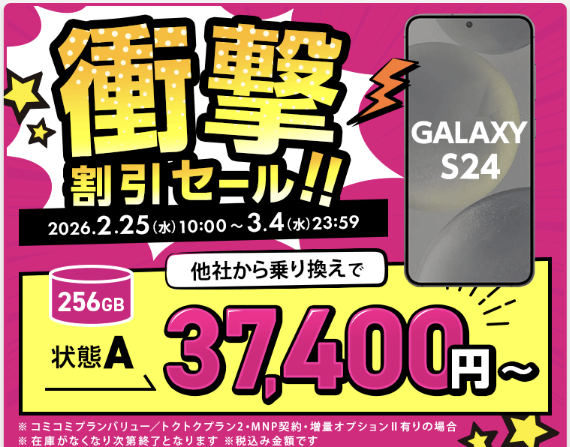 UQモバイルの正規代理店「ゲオモバイルは2月25日より新しいキャンペーンを開始した。3月4日までの期間中、他社からの乗り換えを条件に「Galaxy S24」256GB 中古Aランク品が一括37,400円。