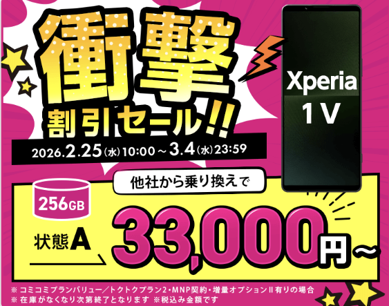 さらに「Xperia 1 V」も中古Aランク品が33,000円でラインアップ。同じく256GB大容量ストレージで、チップセットには高性能「Snapdragon 8 Gen 2」を搭載。発売当時、各キャリア19万円を超えたモデルが信じられないほど買いやすくなった。