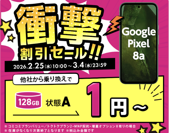 この他、同じくMNPを条件に「Pixel 8a」中古品が一括1円。こちらは128GBとなるが、1円の手頃さを考えれば十分すぎる内容だろう。OSアップデートは2031年頃まで続くため、最新のAndroid OSをいち早く使いたい方に良さそう。