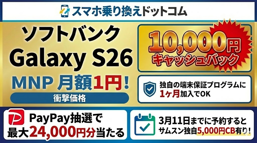ソフトバンクのオンライン専用代理店【スマホ乗り換え.com】が「Galaxy S26」の予約を開始した。他社からの乗り換えで2年間月額1円。さらに10,000円のキャッシュバック付き。