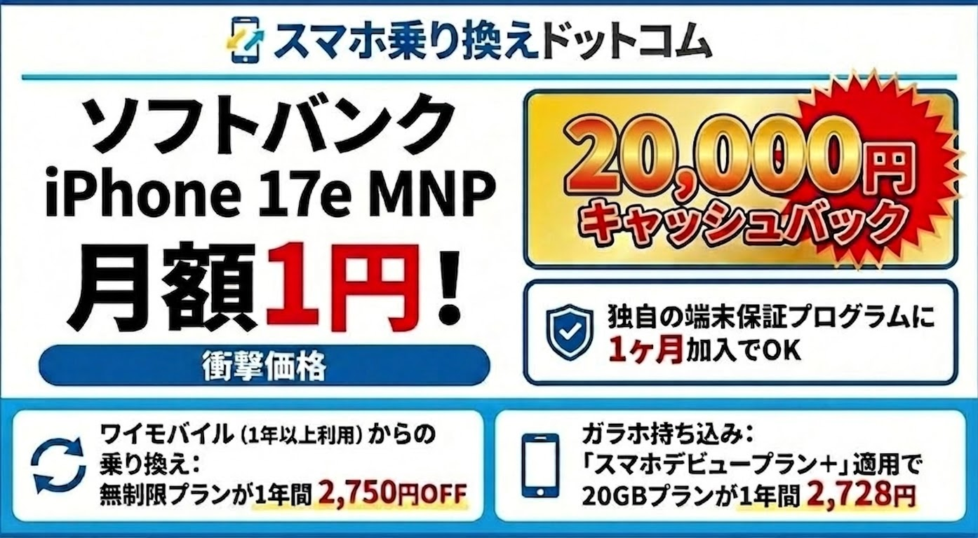 ただし同社では「iPhone 17」256GB MNP月額1円+20,000円CBが実施中。「iPhone 17e」よりもハスペックが高いのにキャッシュバック増額中。