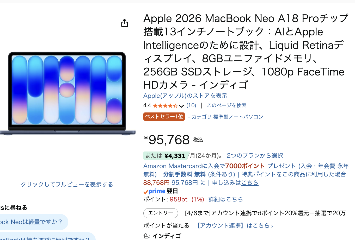 もし「MacBook Neo」の販売価格が95,768円の場合は実質87,895円。アップルストアと同額99,800円なら実質91,806円(7,994P獲得)となる。
