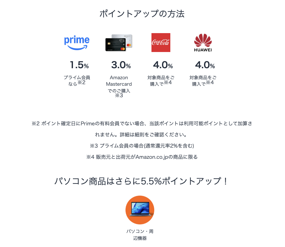 ただし特別加算分(対象カテゴリ+5.5%、Amazonカード+1%、プライム会員+1.5%)の上限は5,000Pまで。