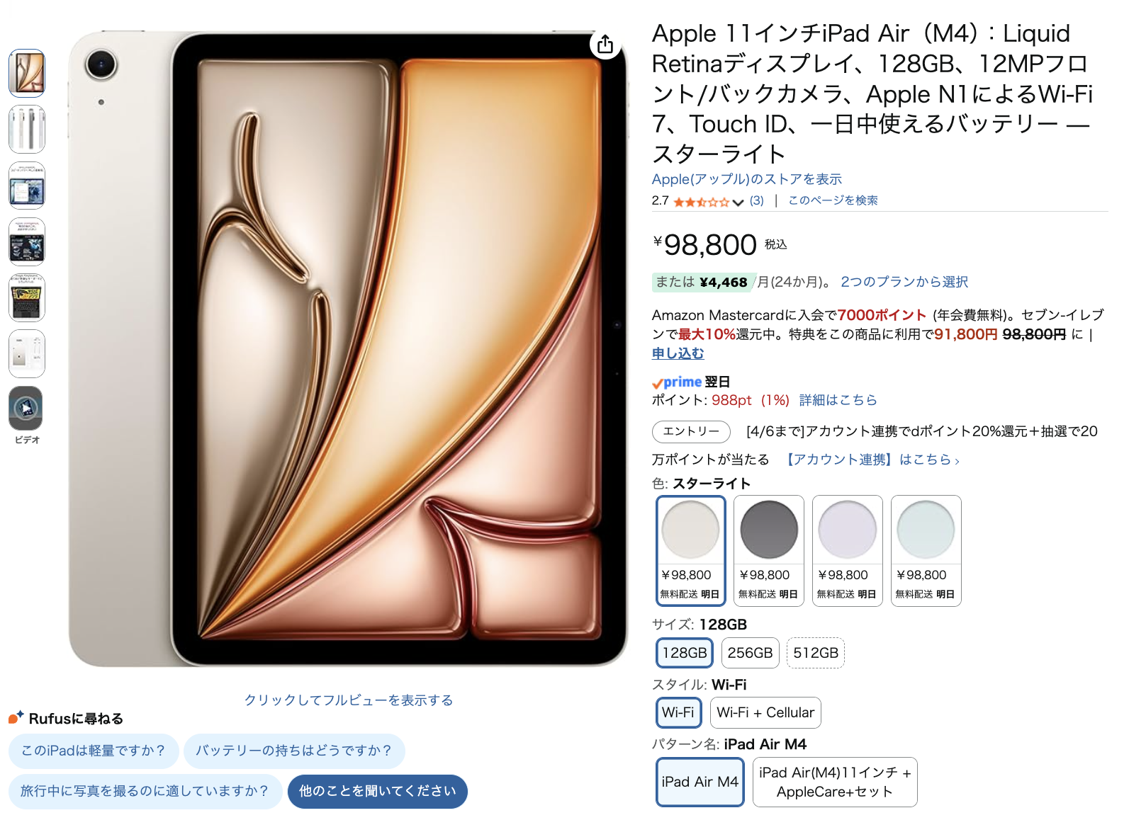 ここで悔しい思いをした方は今度こそキャンペーン対象になっているはず。例えば「M4 iPad Air」128GB 98,800円の場合、