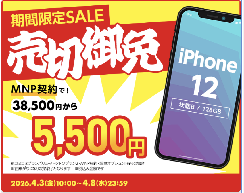 UQモバイルの正規代理店「ゲオモバイル」が6日間限定キャンペーンを開始した。4月8日までの期間中、他社からの乗り換えを条件に中古「iPhone12」64GBが一括5,500円。Bランク品につき状態を気にする方にも好条件。