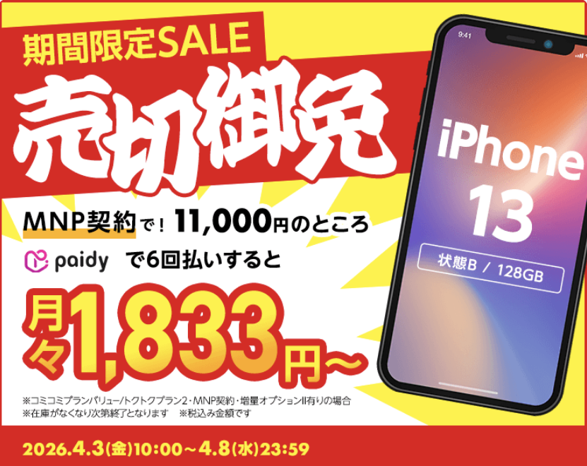 UQモバイル、中古「iPhone 13」128GB MNP一括11,000円