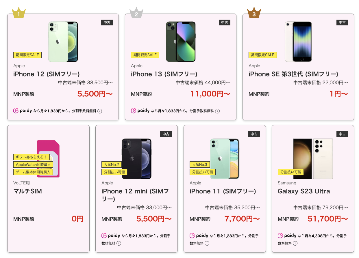 また各キャリアで売れ筋の中古「iPhone 13」は128GB MNP一括11,000円でラインアップ。中古品としてはほぼ最安値で、回線品質の高いUQモバイルで探していた人は今回のセールでもっとも狙い目となりそうだ。