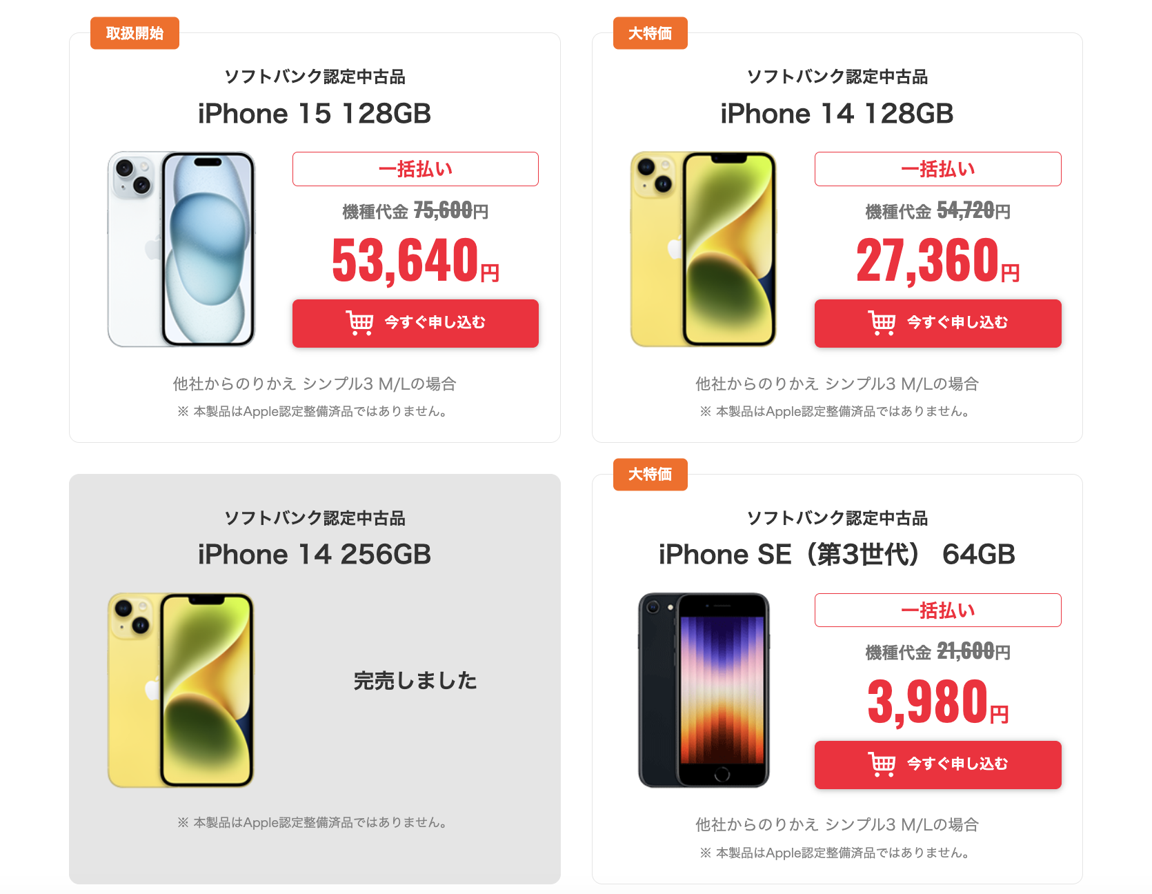 現在MNPを条件に「iPhone 13」19,800円、「iPhone 14」一括27,360円、「iPhone15」一括54,640円でラインアップ。(いずれも128GB)