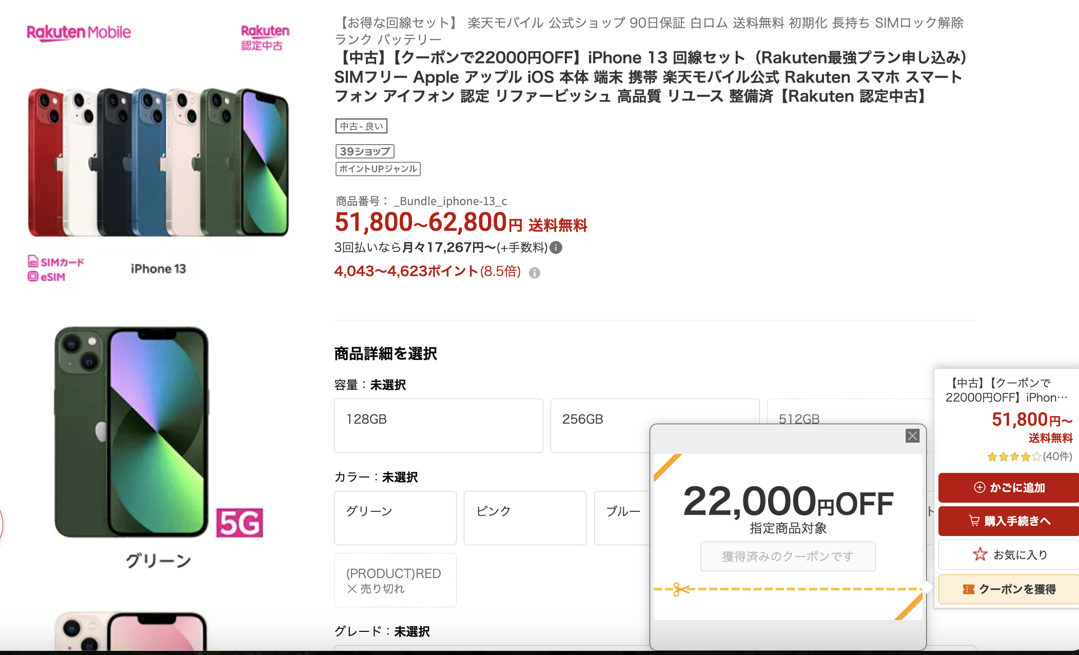 4月3日〜4月8日までの期間中「iPhone 13」128GB(Bランク品)がMNP一括11,000円。
