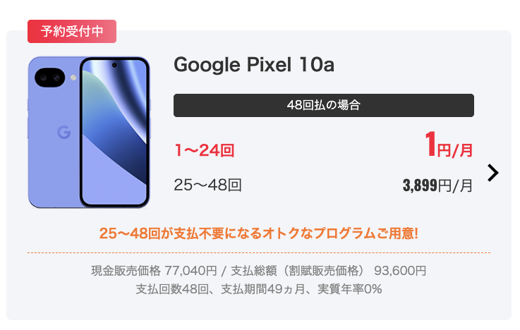 グーグル「Pixel 10a」がワイモバイルでも発表された。端末価格は128GB 93,800円、11万800円。SIMフリー版(128GB 79,900円、256GB 94,900円)と比べて割高。