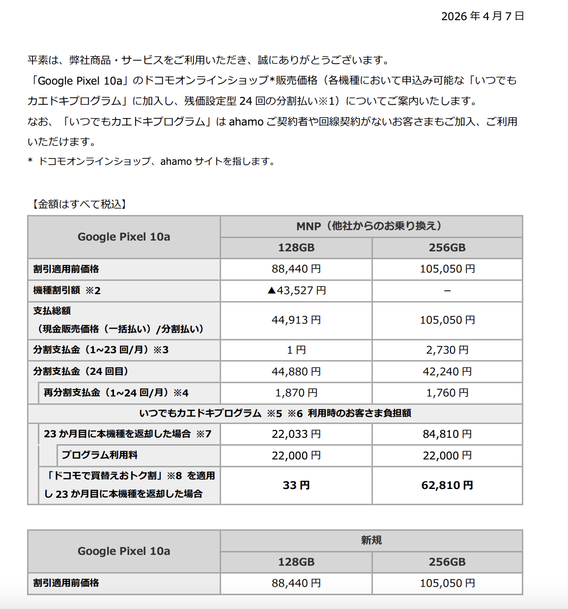 ちなみにお返しプログラムは128GB MNP月額1円(総額33円)で利用できるものの、特典利用料2,000円が発生。ソフトバンクのような強烈な施策もないため、ドコモの場合は一括購入の方が向いているかもしれない。
