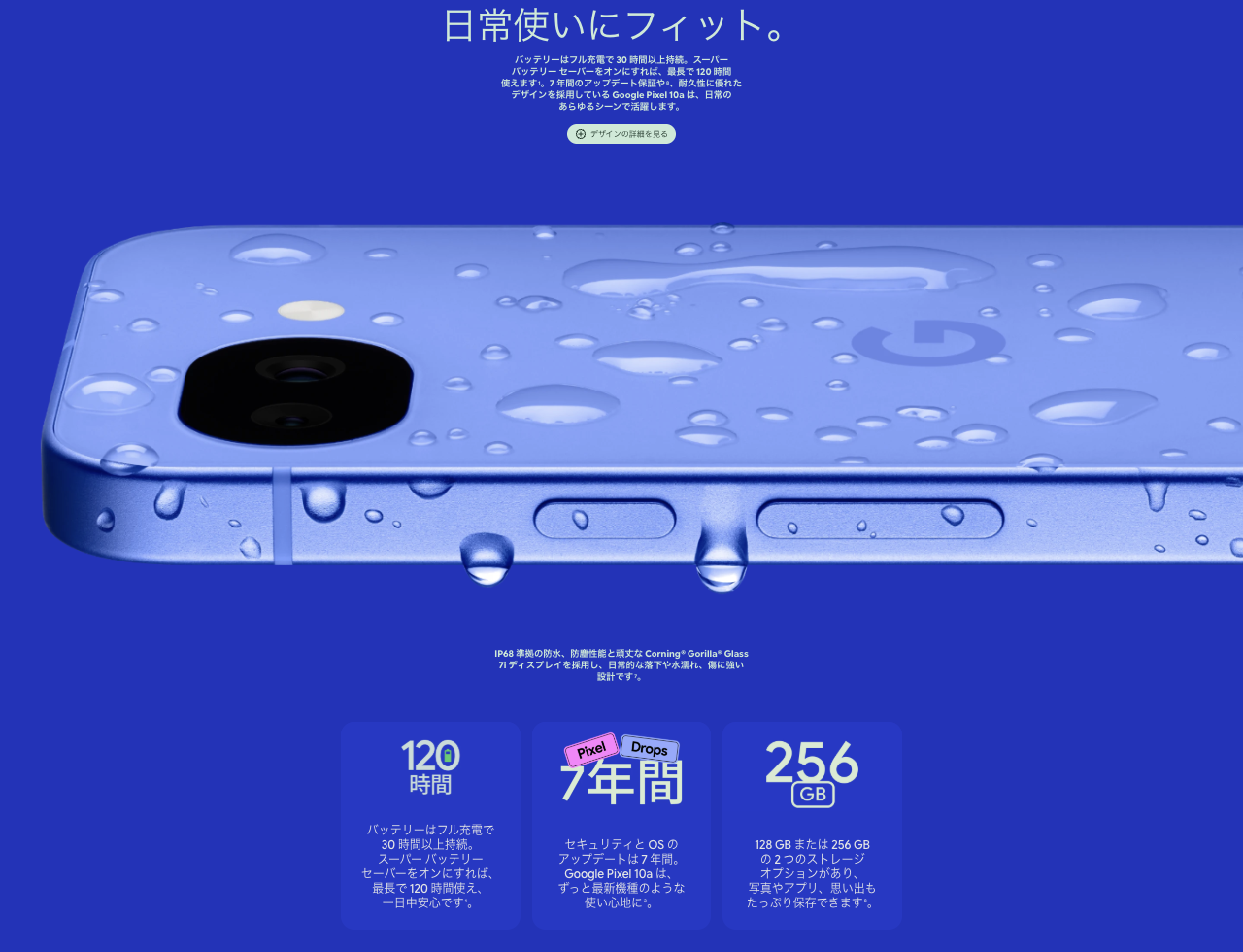「Pixel 10a」はTensor G4、ROM 128/256GB、RAM 8GB搭載のミドルレンジで、6.3インチ有機ELディスプレイ(1,080 x 2,424)を採用する。