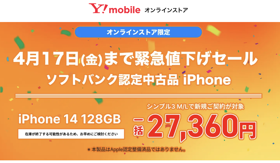 ワイモバイルが中古「iPhone」の割引を強化している。4月17日までの期間中、新規・MNPを条件に以下の通り割引中。