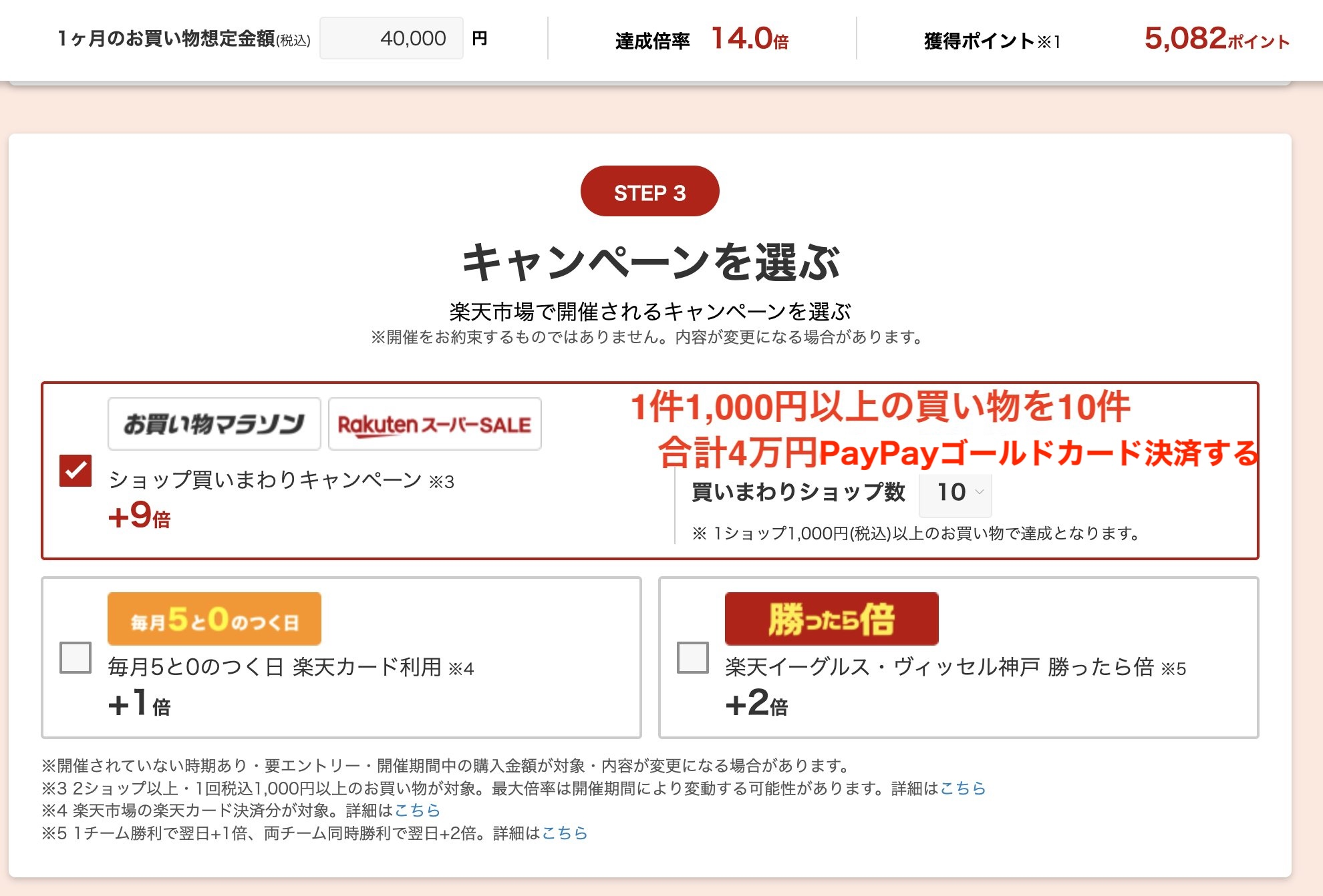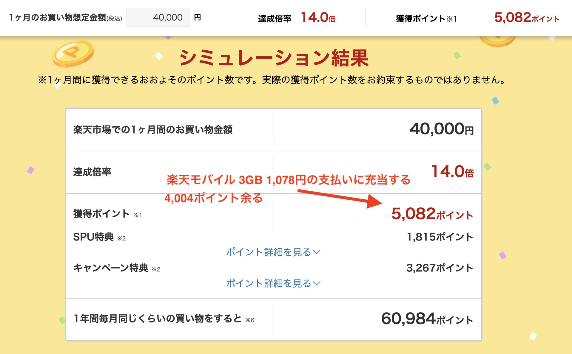 ということは楽天モバイル回線(月額1,078円)を契約して楽天市場の還元率を+4倍にアップさせ、PayPayゴールドカードの40,000円をここで使えば別途+5,082P貰えるかもしれない。