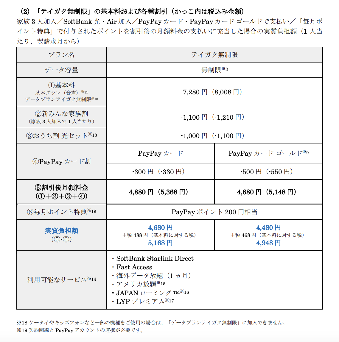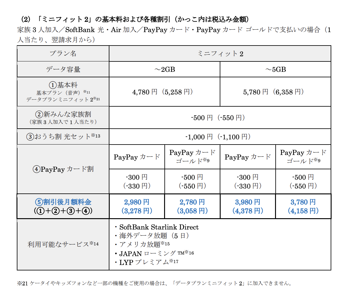 いずれも「Softbank Starlink Direct」、「Fast Access」、「海外データ放題」、「Youtube Premium Lite(1年無料)」等の新サービスが盛り込まれ、現行プランを最大1,980円値上げ。