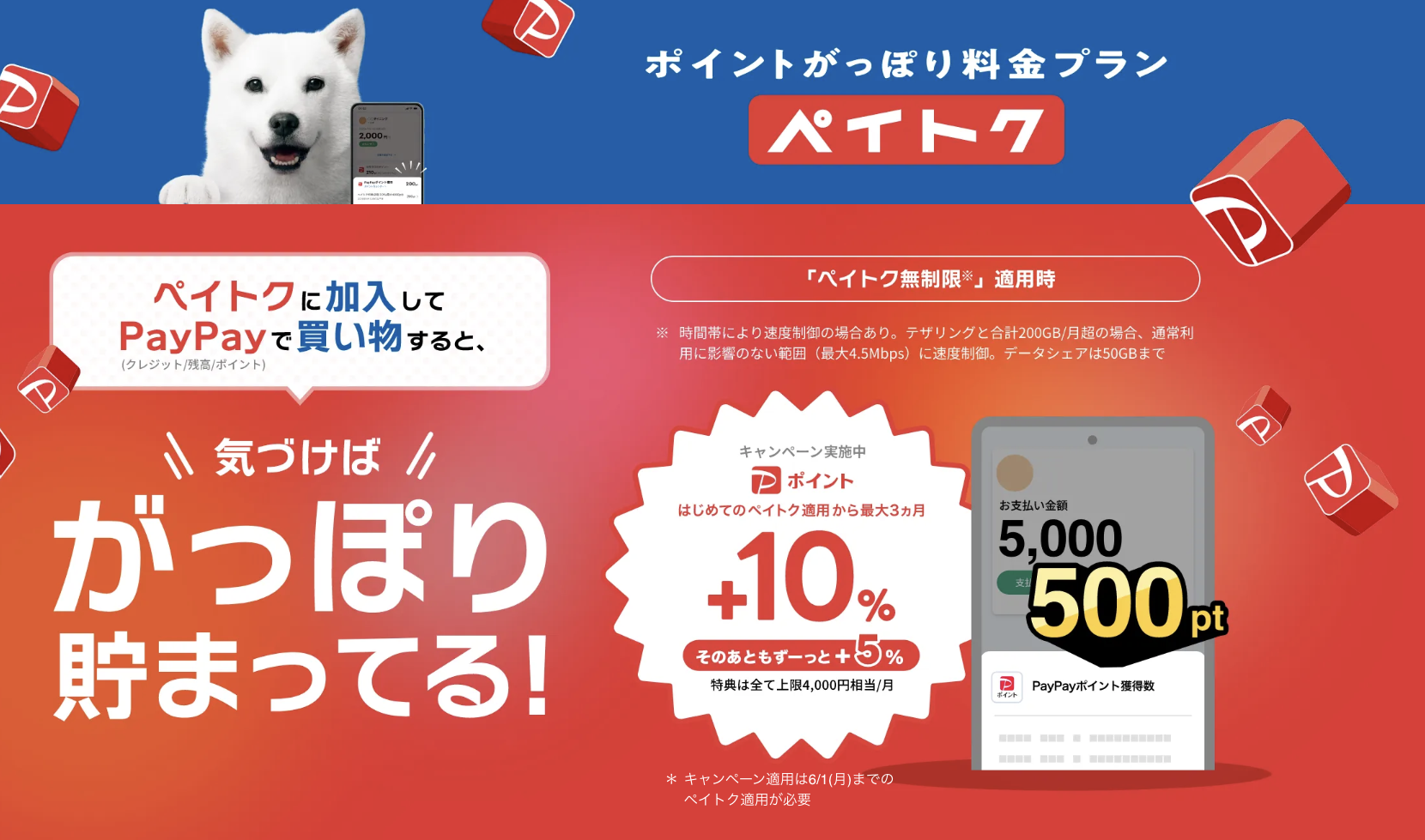 既存の「ペイトク無制限」は最大3ヶ月のみ10%還元で、4ヶ月目以降は5%還元。獲得上限・最大4,000Pは毎月8万円を使うことが求められた。