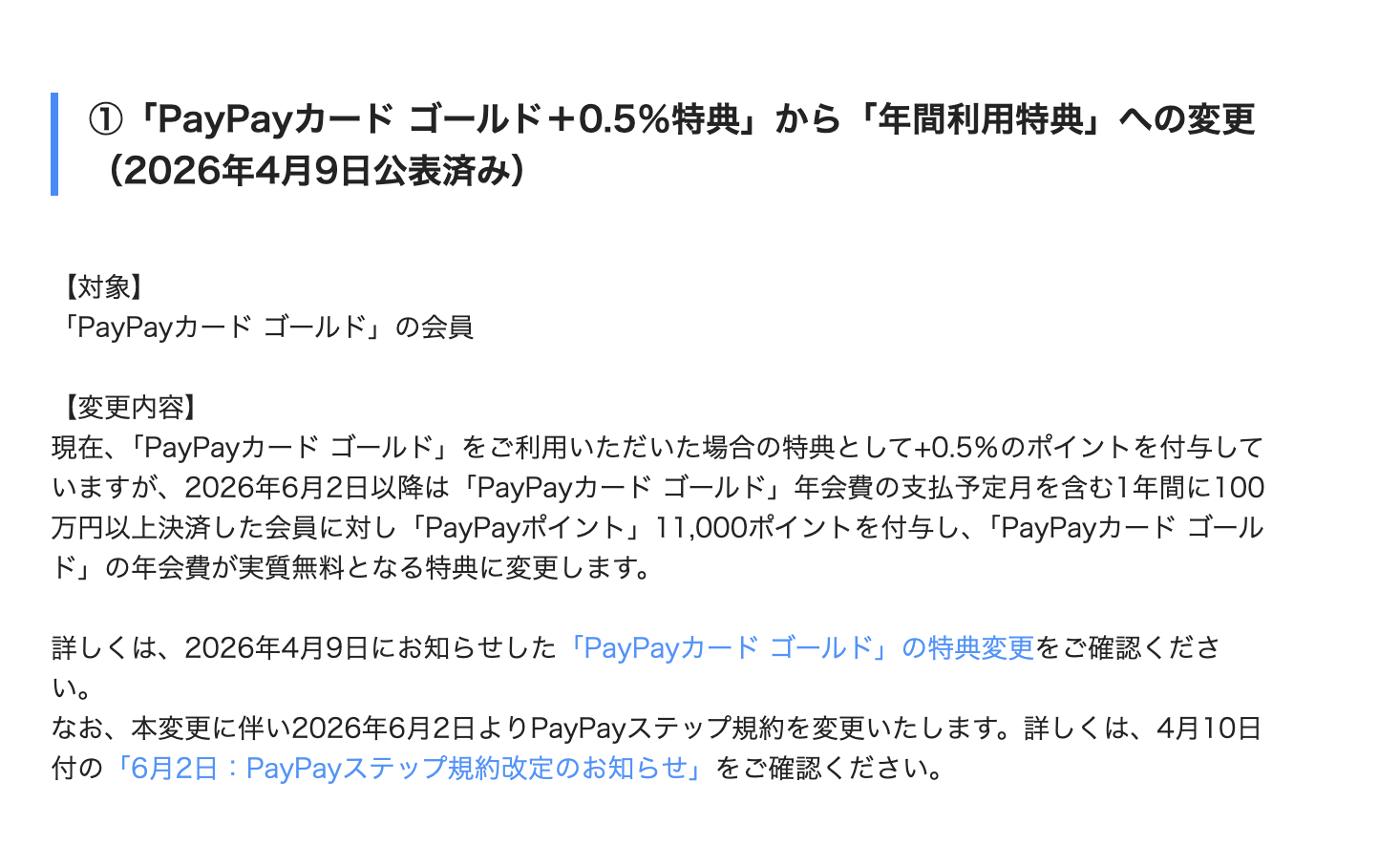 現在のゴールドカード+0.5%特典が、6月2日よりこの100万円決済で11,000P付与に変更)