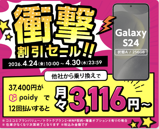 UQモバイルの正規代理店「ゲオモバイル」は、本日より衝撃割引セールを開始した。4月30日までの期間中、MNPを条件に4種類の中古スマホが大特価。
